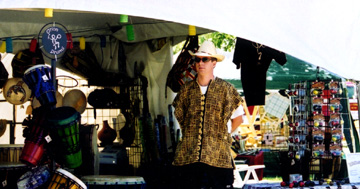 Selling Kashakas with Orion Drums at the Mariposa Folk Festival (July'02) (Photo: Courtesy of Nancy Lais) |